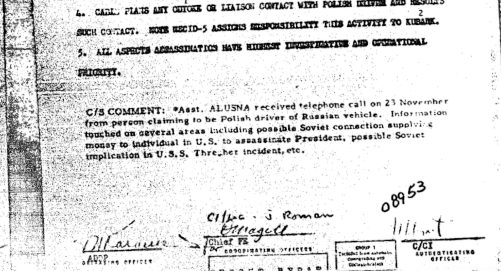 “Asst. ALUSNA [a U.S. intelligence office] received telephone call on 23 November from person claiming to be Polish driver of Russian vehicle. Information touched on several areas including possible Soviet connection supplying money to individual in U.S. to assassinate President, possible Soviet implication in USS Thresher incident, etc.”